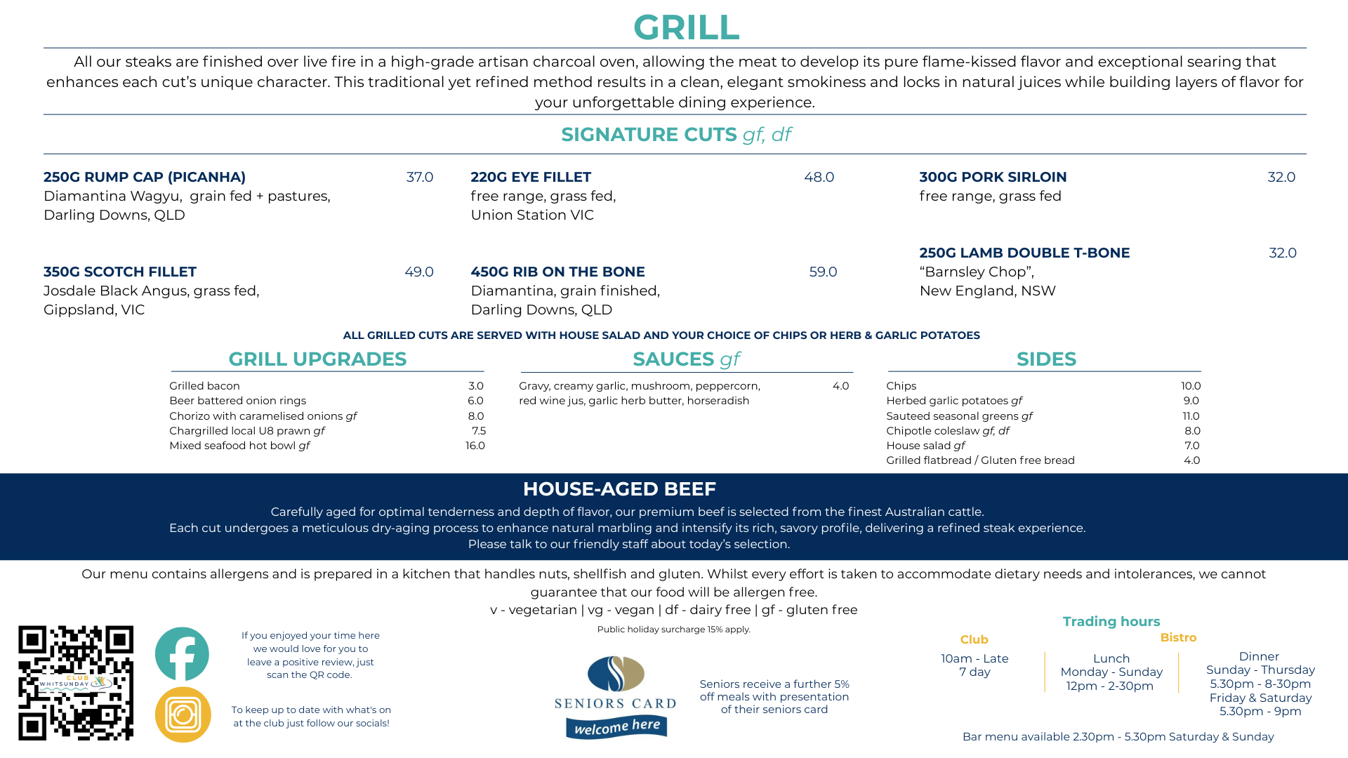 Enjoy a menu packed with club favourites, global flavours, and premium steaks ~ and a full bar of refreshing drinks ~ all served up in a friendly, welcoming atmosphere.