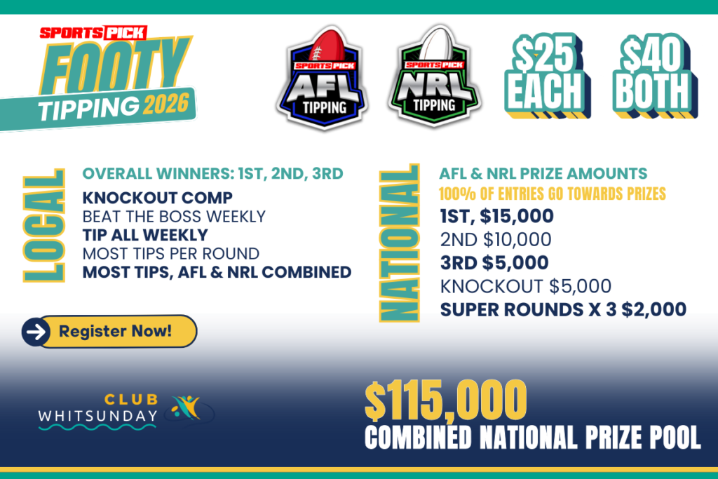 Tickets will be sold by local sporting clubs, who will retain all proceeds from the raffles. The raffles feature fantastic prizes, generously donated by Club Whitsunday ~ including the chance to spin the jackpot wheel.