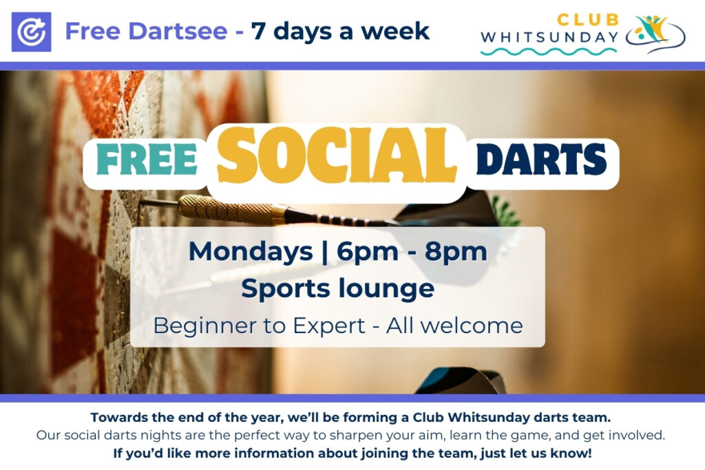 Join us every Monday from 6pm–8pm in the Sports Lounge for Social Darts at Club Whitsunday.