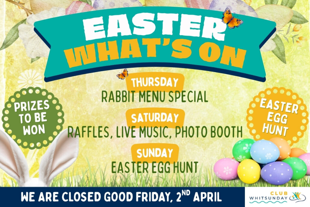 Join us at Club Whitsunday for a fun-filled Easter weekend with great food, raffles and family activities!